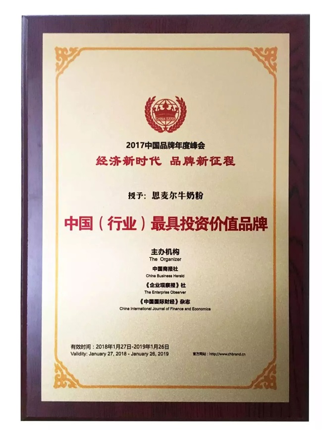 4、2018年1月27日,思麥爾品牌也取得了歷史性的突破,斬獲由中國商報社等單位組織評選的“中國(行業(yè))具投資價值品牌”殊榮!