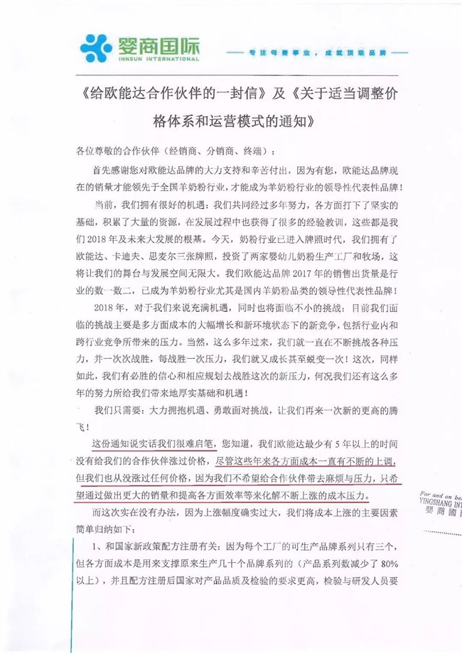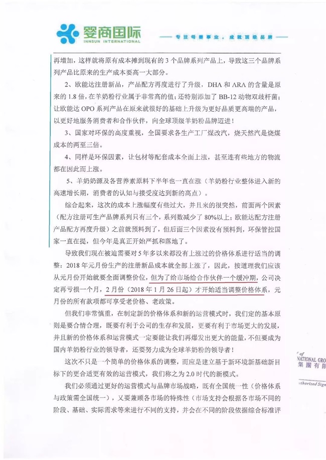 在分析如何應對成本過快上漲,尤其是近期新一輪奶源瘋漲帶來的巨大壓力時,甘董說,春節(jié)前我誠惶誠恐地給經銷商、合作伙伴親自寫了一封2000多字的交流信,信中提及被迫調整價格體系的五個方面原因:一是和國家新政配方注冊有關,二是注冊新品的配方再度升級,三是生產工廠煤改氣,四是國家環(huán)保政策導致包材等配套成本和有些地方的物流成本等全面上漲,五是羊奶奶源及各營養(yǎng)素原料成本的上漲。