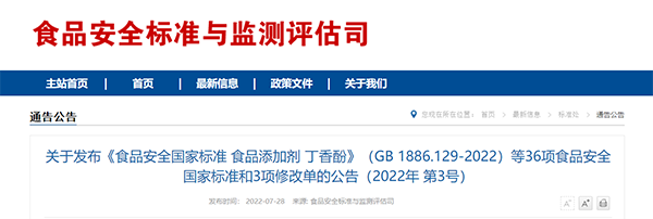 根據《中華人民共和國食品安全法》規定,經食品安全國家標準審評委員會審查通過,現發布《食品安全國家標準?食品添加劑?丁香酚》(GB?1886.129-2022)等36項食品安全國家標準和3項修改單。其編號和名稱如下: