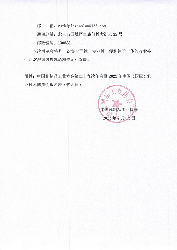 中國(guó)乳制品工業(yè)協(xié)會(huì)第二十九次年會(huì)暨 2023年中國(guó)(國(guó)際)乳業(yè)技術(shù)博覽會(huì)招展通知