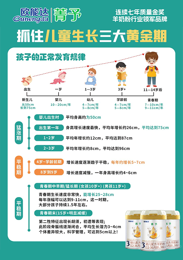 3? 青春期(10-18歲):孩子迎來第二次生長發育高峰,不僅身高猛增,性器官也開始發育。此時要保證充足的睡眠和均衡的飲食,助力孩子順利度過青春期。???? ??家長們,不要錯過這三大黃金期,讓我們一起守護孩子的健康成長吧!??#歐能達 好羊奶
