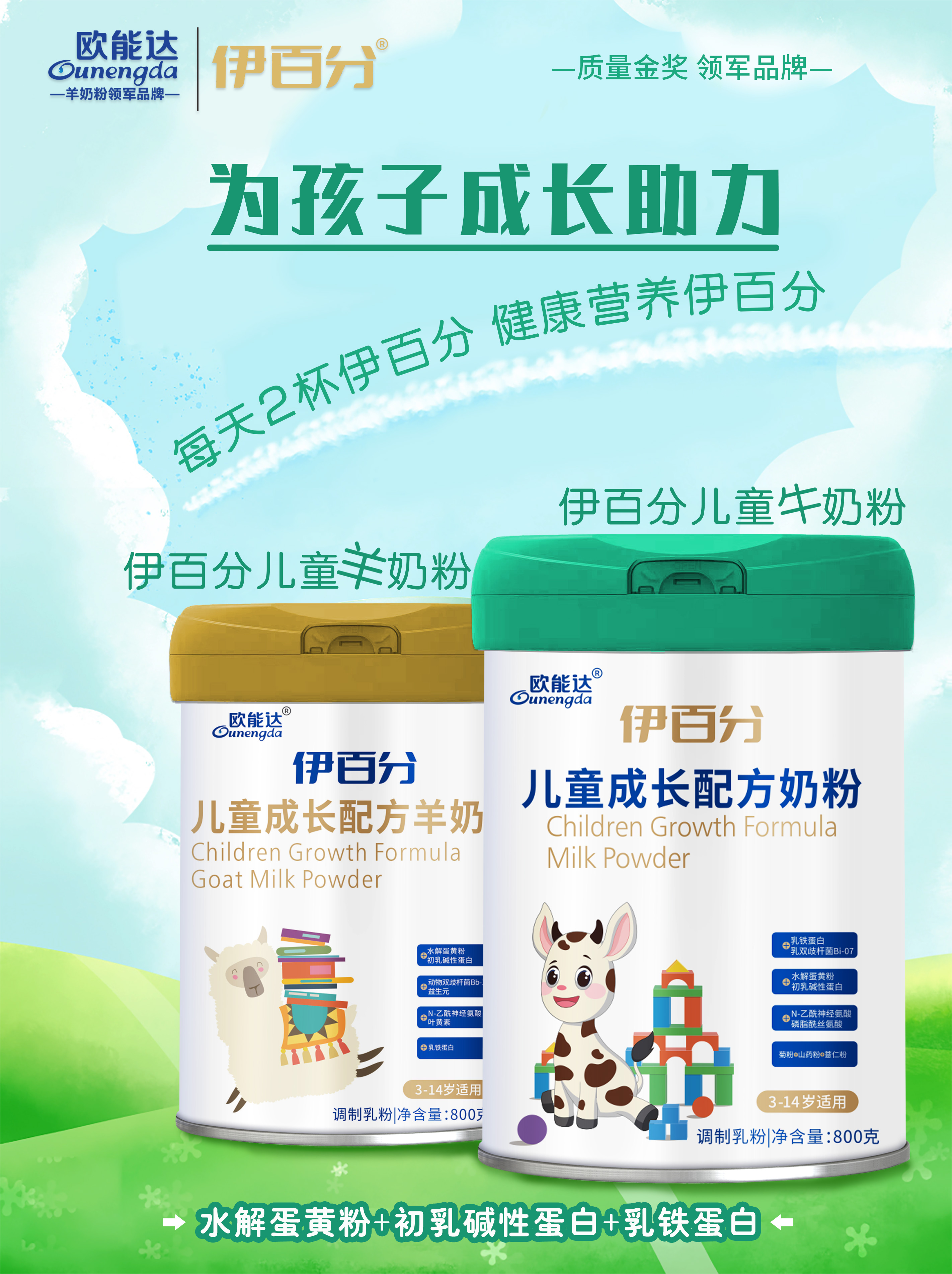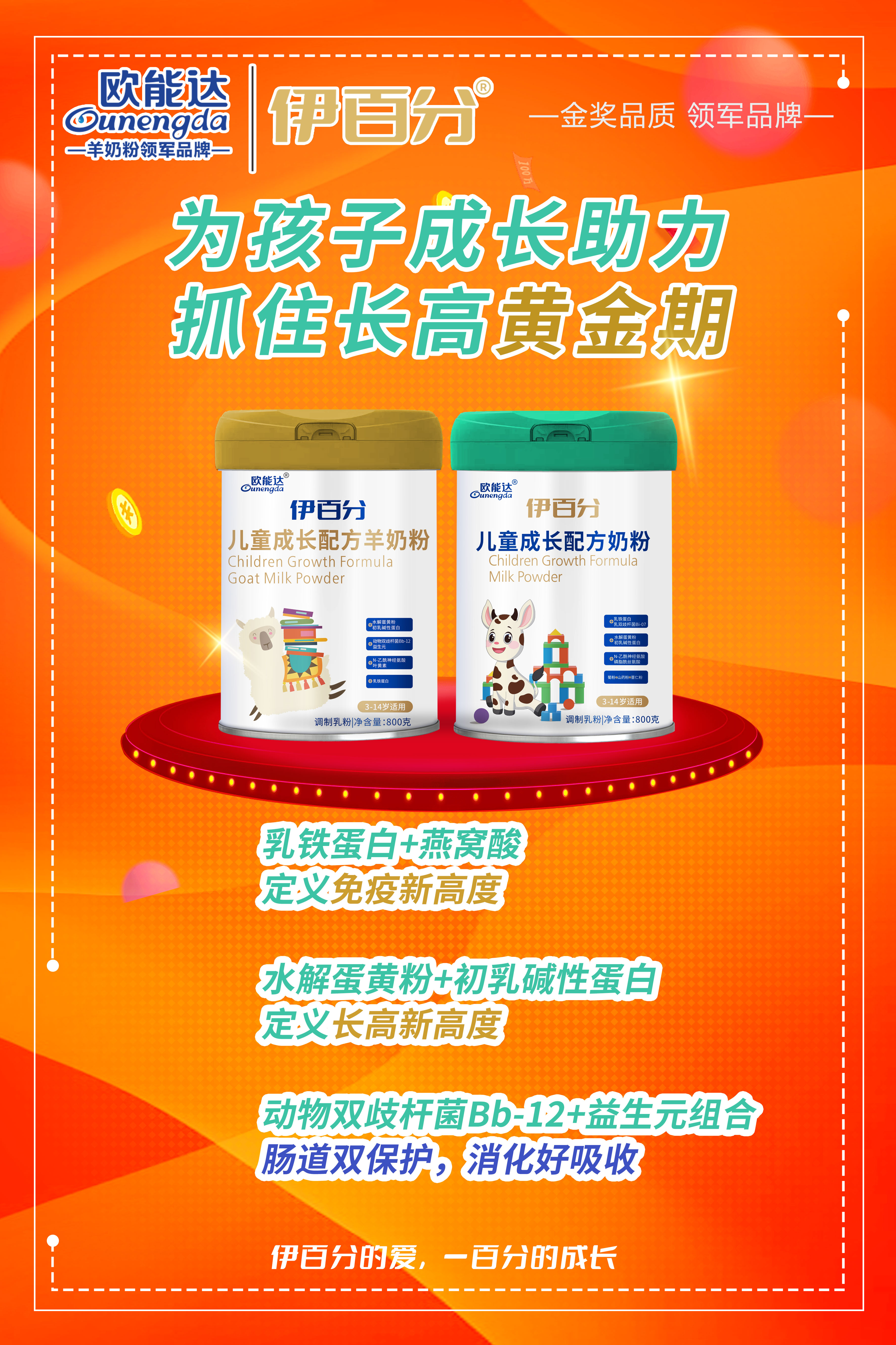 最近這幾天呀,我們就要按照上學的作息規律慢慢適應起來了,早睡早起,營養均衡,以飽滿的狀態迎接每一天,話說3-14歲是寶寶成長發育的重要階段,這階段不管是身高也好,抵抗力也罷,都是尤其關鍵的,那我們這款伊百分兒童成長配方羊奶粉是一款高端兒童學生成長奶粉,深度滿足兒童學生成長發育特征和營養需求,好原料、高配方,用心助力孩子“更高、更智、更優”!這也是我們設計配方的初心,讓兒童學生能有全方位的發展!
